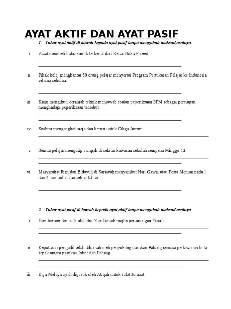 Ayat aktif dan ayat pasif. Penukaran antara ayat aktif dan ayat pasif merupakan salah satu topik soalan yang mungkin diuji pada peperiksaan spm bahasa melayu. 8,507 views jun 1, 2021 ….more.more . Ayat aktif dan ayat pasif merupakan antara soalan sintaksis yang popular dan sering diuji dalam peperiksaan. Cara menukar ayat aktif kepada ayat pasif youtube . You can do the exercises online or download the worksheet as pdf.